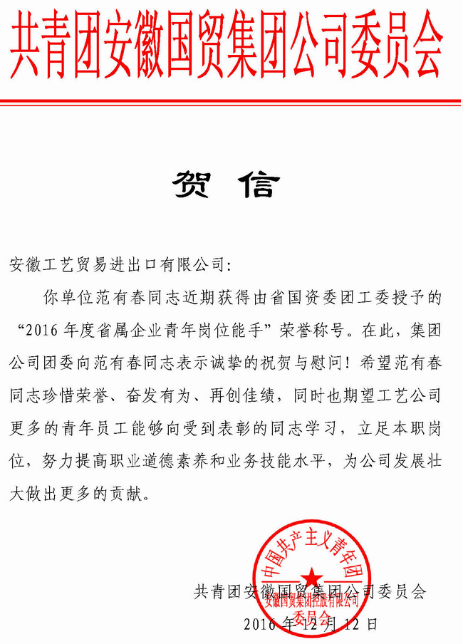 ?2016年,安徽省屬企業廣泛開展了青年崗位能手爭創活動,涌現出一大批愛崗敬業、技能精湛、勇于創新、貢獻突出的優秀青年人才。近期,省國資委團工委授予省屬企業38名同志 “2016年度省屬企業青年崗位能手”榮譽稱號,其中國貿集團2名,我司業務員范有春同志獲此殊榮。